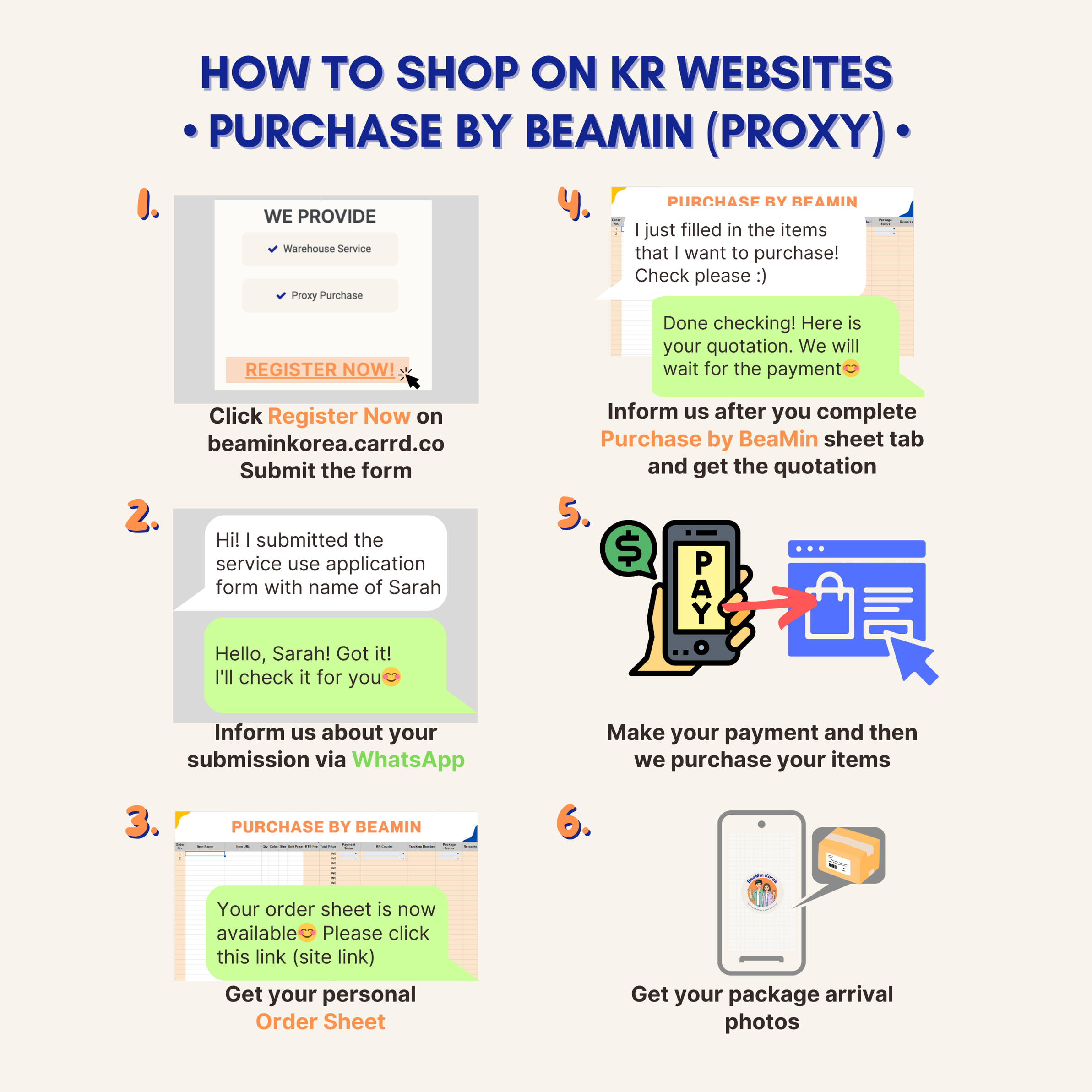 Personal order sheet and dashboard will be provided to track all orders, purchase status, package arrival status, and shipping progress.