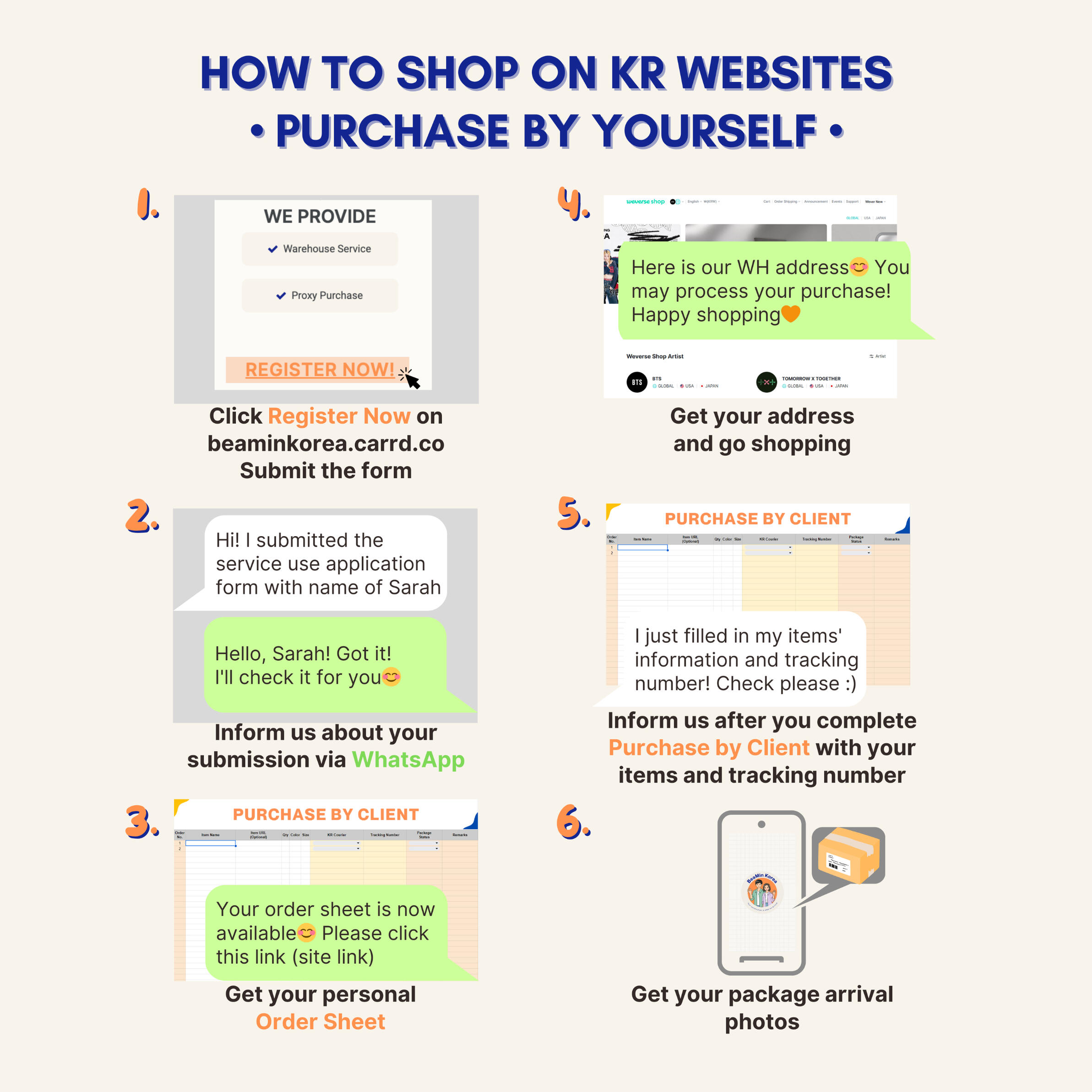 Unregistered packages will be listed in Purchase by Client (PC) sheet—only the tracking number. BeaMin is not responsible for any loss if the item details are not provided.